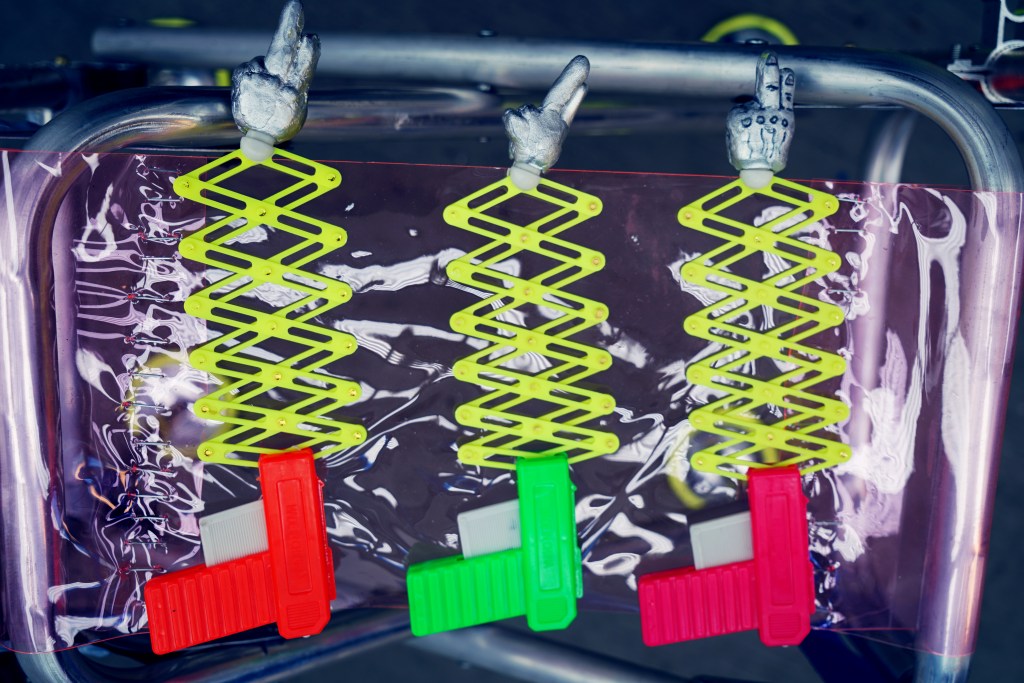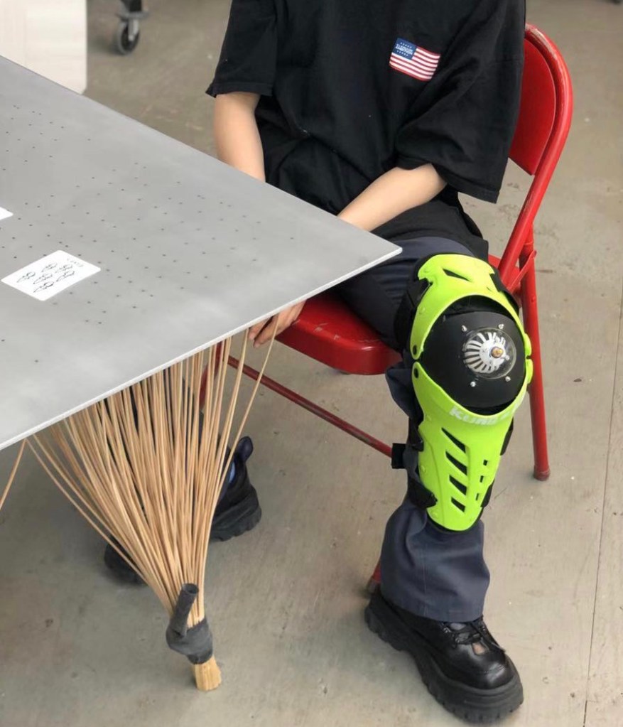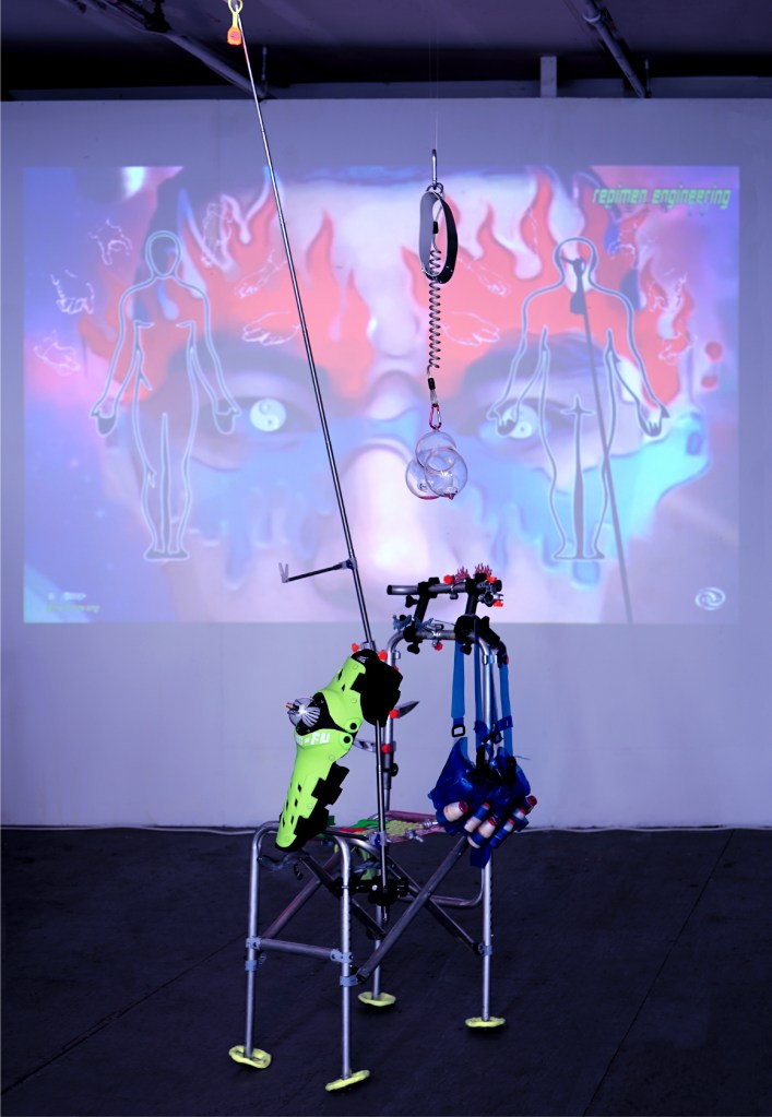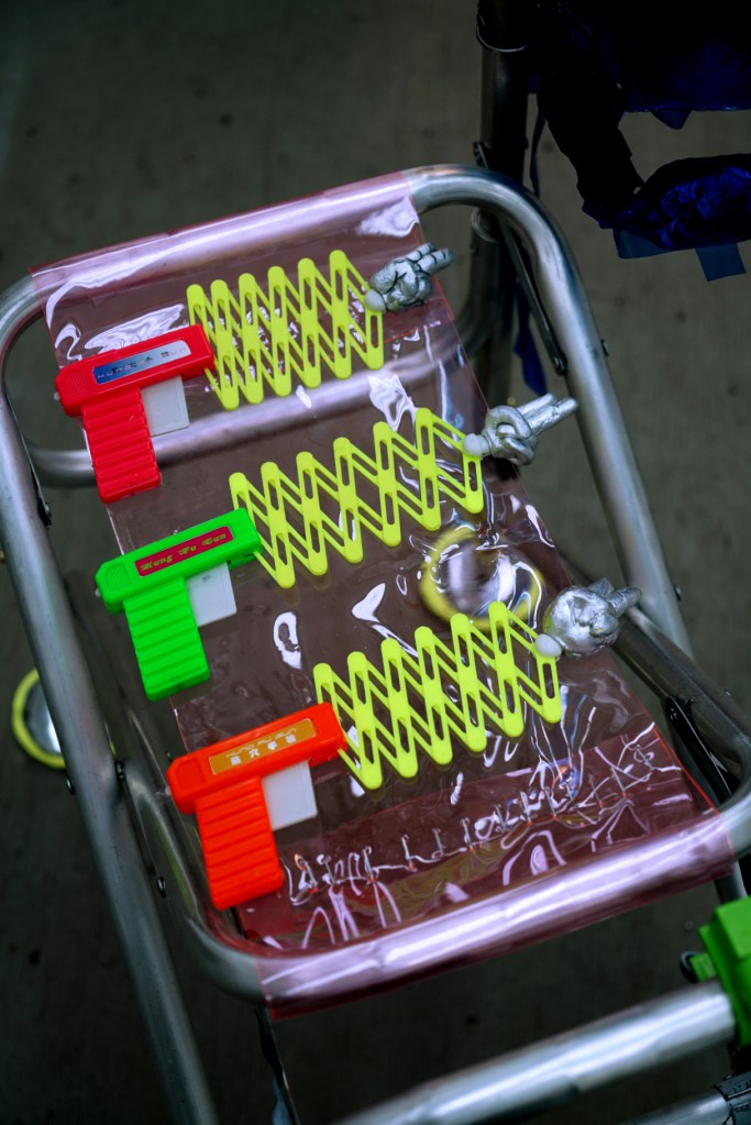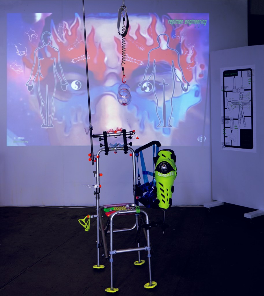 Meltingwang is addicted to appreciating technical regimen products from the perspective of science fiction. Regimen studies how “human” evolved into “Superman,” accumulating new experiences of sensory operation. His research project “Regimen Engineering”” collects and extracts these sensory experiences to find future modes of human reinforcement. Wearable components include: negative eyewear, Tan-Tui Knee Pads designed according to Shaolin force methods, a Kung-Fu Gun, a logo vest based on Chinese medicine’s idea of stimulating various parts of the body, and a Bungee Chest that externalizes its inner workings via a colorful neck ring.