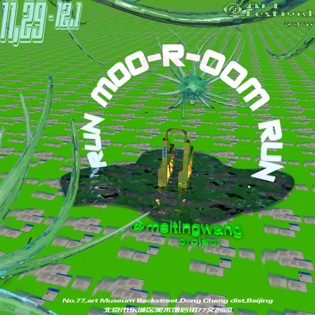 moo-r-oom是一个共生符号,由moor和room两个字母相同但结构不同的单词复合而成,用来标志受网络影响的思维形状。 meltingwang在@艺术节现场制造了一个奔跑项目,将以悠闲的姿态穿梭于 moo-r-oom世界中。